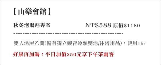 商品訊息簡述: 只要588元(雙人價)即可享【山樂滅]】原價1180元秋冬泡湯趣專案:雙人湯屋乙間(備有獨立觀音冷熱雙池/沐浴用品),使用1hr。好康再加碼:平日加價250元享下午茶兩客