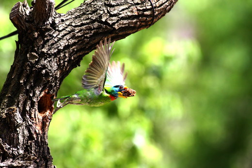 原來,枯樹枝上有一個五色鳥的巢穴,裡面有一巢小鳥,正等著鳥爸鳥媽捕捉各類