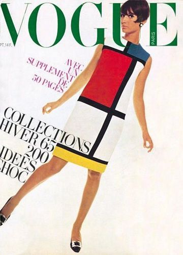 Yves Saint Laurent是一位和藝術淵源匪淺的設計師。搭上A字洋裝的盛行,1965年YSL耳目一新的蒙德里安系列(The Mondrian Collection)成了60's的時尚標籤。全系列六件洋裝呈現以蒙德里安為首的荷蘭風格派(De Stijl)、各樣的直線與方形圖案,與強調直筒服裝線條相互呼應;特別的是這些圖案非印刷布花,而是染過色的羊毛混絲平織布拼接而成。