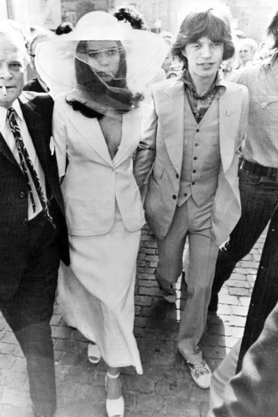 滾石創辦人之一Mick Jagger婚禮上,Bianca身穿YSL白色Le Smoking