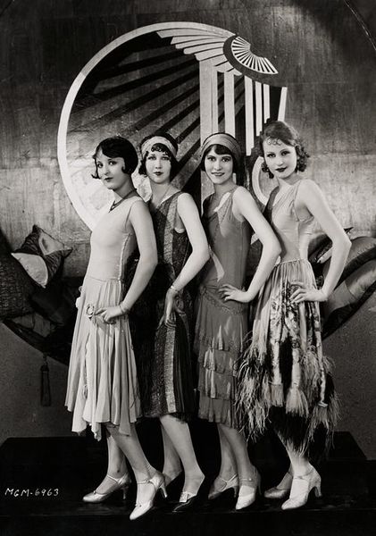 1920是爵士的年代,女生的流行是穿著華麗、及小腿肚的「短裙」和低跟鞋,方便跳舞。