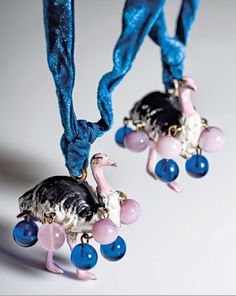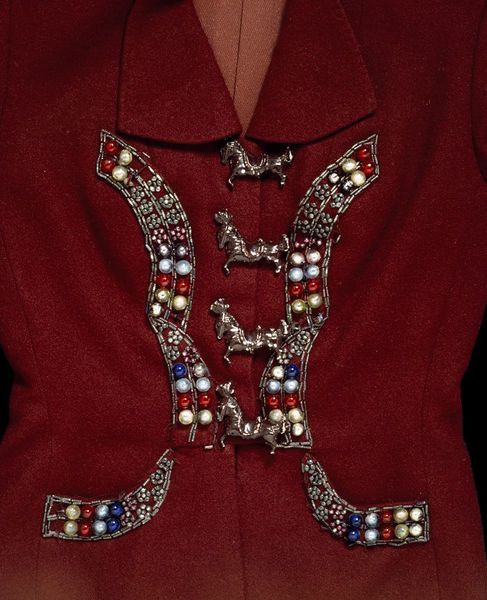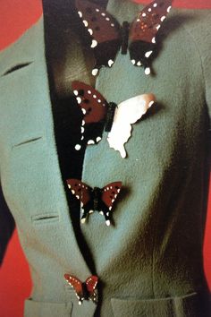 當然,釦子也不會是Schiaparelli能放過的細節。1938年的Circus collection中,除了充斥Trompe L’oeil的錯視迷幻,許多小飾品像是體操員金屬釦,鴕鳥墜子,昆蟲項鍊等等也搞怪的令人莞爾。若是現在推出在市面上販售,相信大家一樣會陷入瘋狂吧!