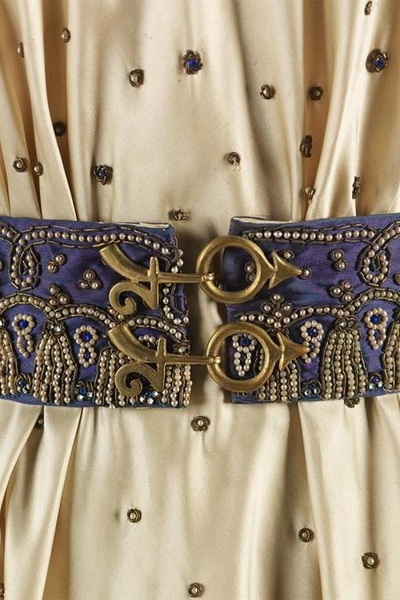 星座也跟希臘神話故事有關。下面兩件衣服上精美的亮片刺繡與金屬裝飾,講的是太陽神阿波羅與他每天駕著四馬戰車將太陽拉上空中的意象。