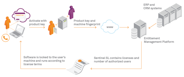 終端用戶以電子方式將軟體供應商提供的唯一產品密鑰傳輸給遠端的 Sentinel EMS 服務器,一個包含授權條件的Sentinel SL 保護密鑰隨後被發回並安裝在最終用戶電腦中,進而激活軟體。 Sentinel LDK 中包含的 EMS API 可以與您的後端系統(如ERP或CRM)集成在一起。