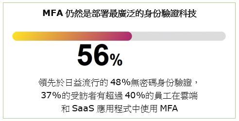 儘管IAM的重要性以及多因素身份驗證是强大身份驗證的重要組成部分,但MFA的採用仍處於淺水階段。與2021年相比,多因素身份驗證 (MFA) 的採用略有增加;2022年為56%,高於2021年的51%。然而,MFA仍然是最常用的IAM技術,其次是基於雲端的單一登錄(SSO),佔51%。企業還沒有完全接受無密碼技術,只有48%的企業表示無密碼是他們首選的身份驗證方法。