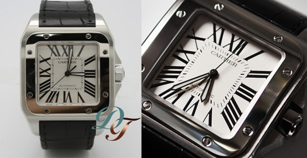 Cartier Santos 100系列:搭配不鏽鋼錶殼與鱷魚皮摺疊扣錶帶,41mm超大尺寸,獨特的有形的外觀,為此錶追尋著現代的風格與全新的時尚觀感。