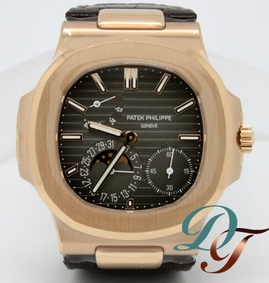世界名錶/男錶款式 Nautilus 系列:搭配18K玫瑰金錶殼與鱷魚皮錶帶,深灰色螢光塗層金質立體時標面盤,具有月相顯示與動力儲存功能,融合複雜功能與優雅的細膩設計,使此腕錶配戴起來更具文雅與時尚。