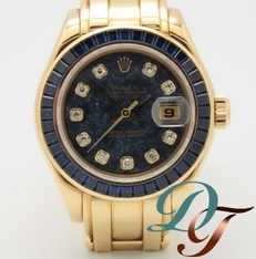 此款勞力士手錶搭配著18k黃金錶殼與原鑲藍寶石鑽圈,錶盤為原鑲藍色寶石搭配著10顆鑽石時標面盤,為此款腕錶帶來全新外型與特色。
