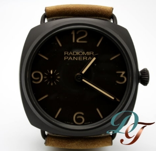 Radiomir Composite ® 3 DAYSs 系列: 搭配鋁材陶瓷化錶殼與棕色皮革錶帶,P.3000自製手動上鍊機芯,動感的外觀與獨特的外型,融合透背式錶殼,散發出內涵兼具的運動風格。