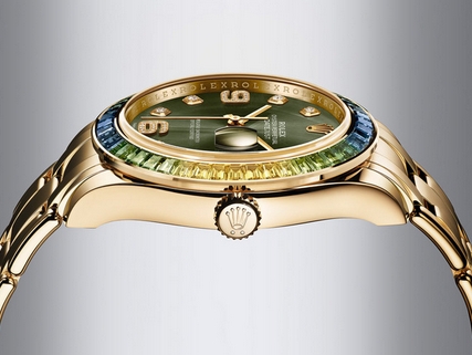 這些精緻的珠寶腕錶裝配新款 3235 型機芯以及華麗奪目的外圈,外圈鑲嵌48顆漸變色調的方形切割藍寶石── 18 ct 白色黃金款式由藍色漸變為紫紅色,18 ct 黃金款式則由藍色漸變為綠色,或橙色漸變為黃色。亮粉、亮綠及亮橙藍寶石錶款均備有彩色錶面配鑲鑽的6和9數字,或密鑲錶面配鑲鑽錶帶。