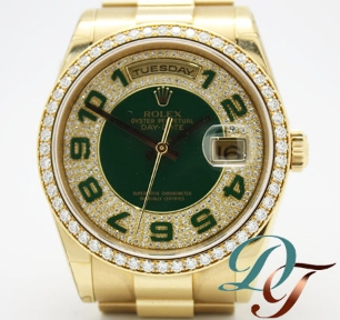 此款勞力士手錶原鑲鑽石錶圈搭配18黃K金錶殼與18K黃金鍊扣錶帶、搭配50周年紀念密鑲鑽石錶面與綠色琺瑯阿拉伯數字時標錶面。