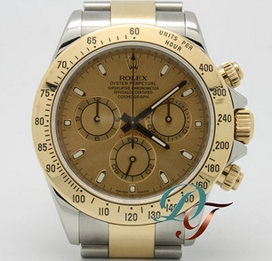 ROLEX DAYTONA系列:搭配18K黃金雨904L不鏽鋼錶殼與錶鍊帶,具12時、30分、60秒計時功能,金黃色錶盤時標面,融入計時功能錶盤,呈現出華麗時尚的魅力運動風格。
