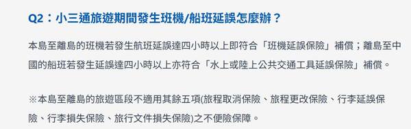 8. 三四月是金門的霧季,無論是飛機和船班都經常誤點或取消,為減少損失,可買含不便險的旅平險。因為金廈小三通涉及國內飛機航班和『國際』船班,據說只有明台保險公司才會支付此種交通延誤的旅行不便險(常見方案為延誤滿 4 小時賠償 新臺幣 3,000 元,且多採取定額給付)。明台保險公司相關網路說明