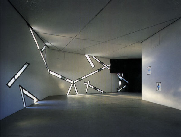 從空中俯瞰《柏林猶太博物館》,建築立面就像一道道被割裂的傷疤。內部空間充滿直線、銳角以及各種窄仄的虛空地帶,讓人無法心平氣和。光線從不規則形狀的窗戶,以暴烈的直射、投射進入空蕩的室內,曲折幽暗,陰森冷冽,通往一個個沒有出口的所在。