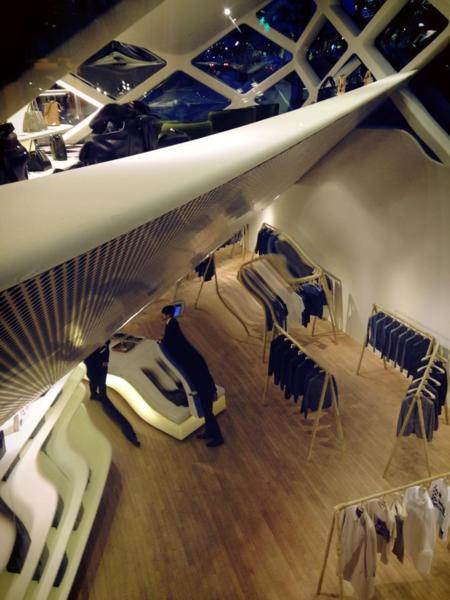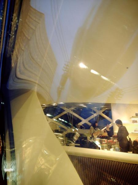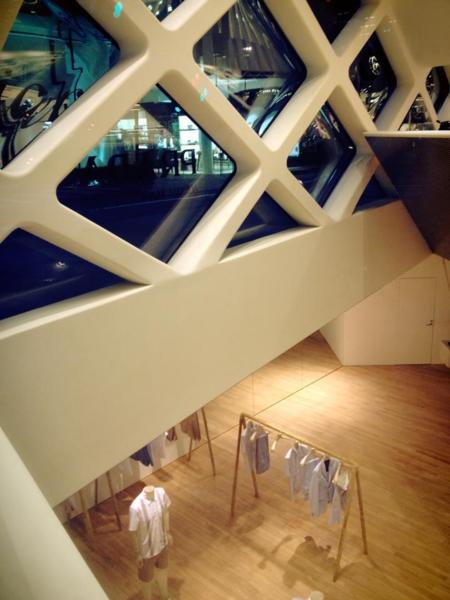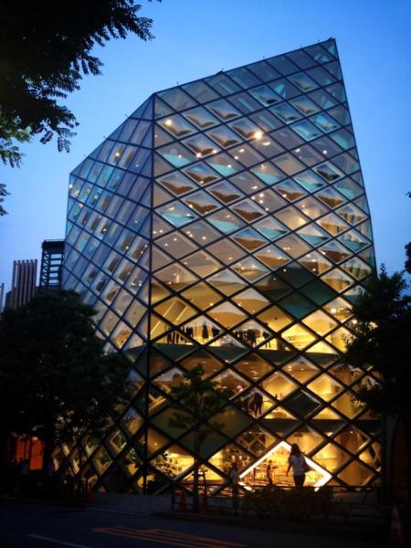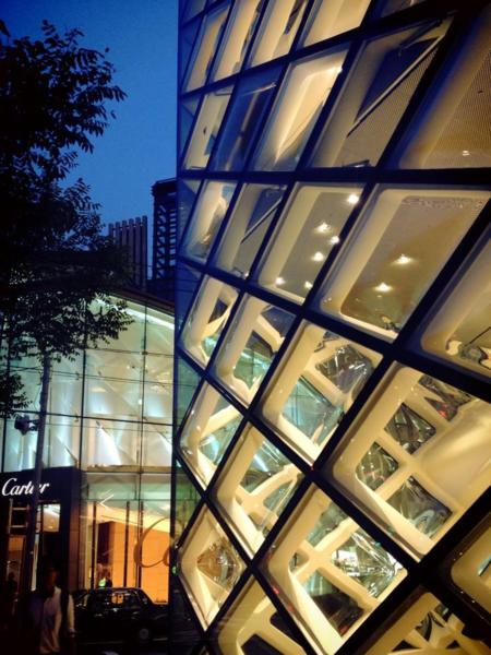 這座外觀像一顆超大水晶的建築,在雜誌上看過不知幾回,實際到訪仍驚艷於它的美麗。它是用840塊平面玻璃及凸透鏡玻璃,拼成6層高、由蜂巢狀玻璃所組成的建築體。不論你從哪個角度,由外往內或由內往外看,眼中所見都是被一片片玻璃折射出的綺麗光景,晶瑩閃爍,如真似幻,宛如走進時尚迷宮,沉醉在霓裳羽衣裡不願醒來。