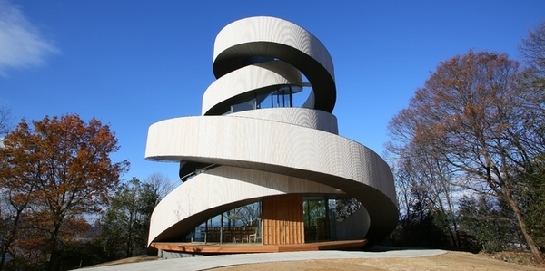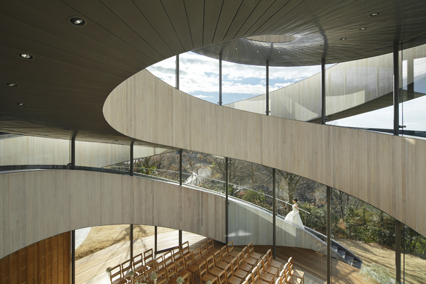 日本新生代建築師中村拓志設計的緞帶教堂,外觀有如被兩條白色緞帶纏繞而上,以螺旋狀階梯環繞整座建築。