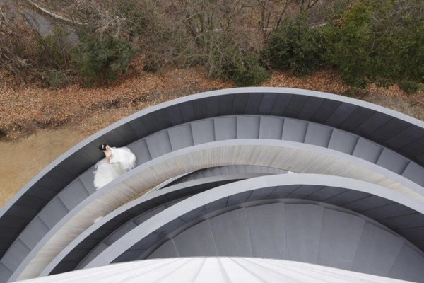 日前在電視新聞看到日本新銳建築師中村拓志,位於廣島所設計的一座婚禮教堂。外觀有如被兩條白色緞帶纏繞而上,以螺旋狀階梯環繞整座建築。特別的是這兩條混凝土緞帶代表不同路徑,婚禮進行時,新郎、新娘分別由不同的樓梯出發,各自拾級而上,最後在頂樓交會,象徵新人的珠聯璧合與兩個家族的締結良緣。