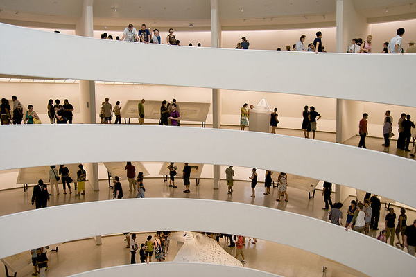 萊特以螺旋狀的斜坡道貫穿整座美術館,欣賞藝術品就順著坡道一圈圈往上走,創造了樓地板、展場空間、視點延伸,連續不斷的空間特性。