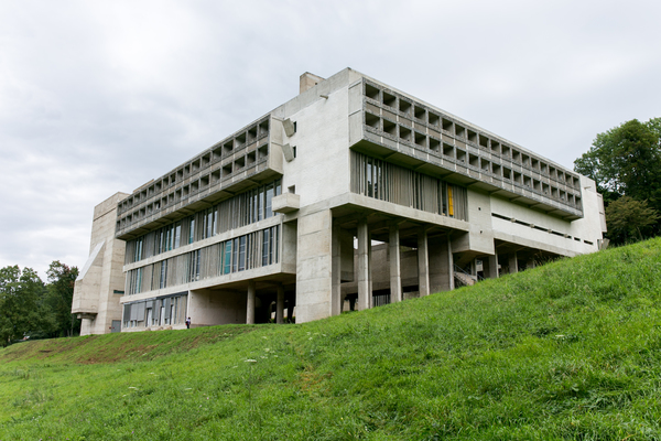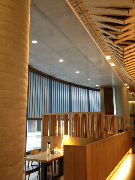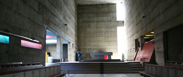 相對於安藤清水模,下圖這種「木紋模清水混凝土」近看不太乾淨,但有一種很MAN很粗獷的質地,似乎更適合做為大型量體的素材,例如柯比意位於法國里昂近郊的《拉特瑞修道院》,簡單、純粹的方形量體相當凜冽樸實,一心惟爾的空間氛圍很適宜修行。這種素材在某些商業空間也常見,任室內管線裸露,試圖創造一種LOFT的狂放不羈。
