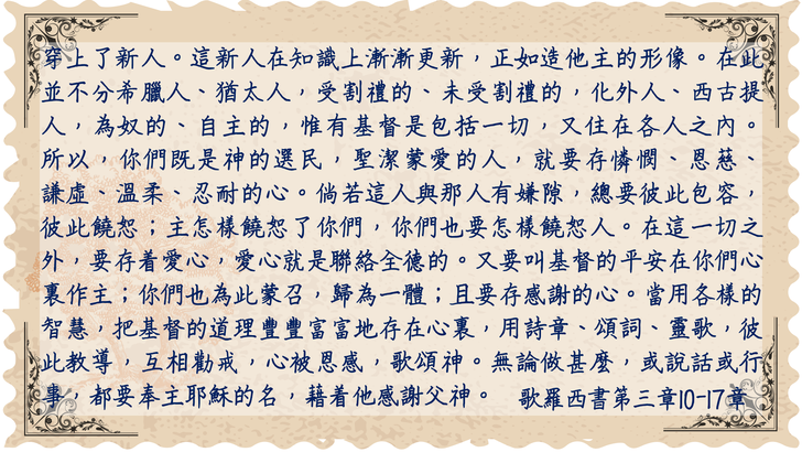- 感恩的關鍵: 經文中多次提到感謝(15、16、17節)。我們得以穿上新人並不斷更新,都是因為恩典。