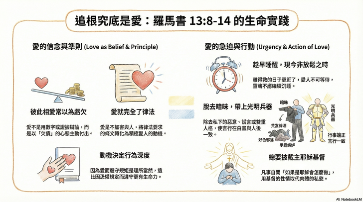 - 順服權柄後的出路:在羅馬書前面探討完順服掌權者所帶來的憋屈與壓力之後,保羅緊接著提出了人際與生命問題的終極解方——「愛」。