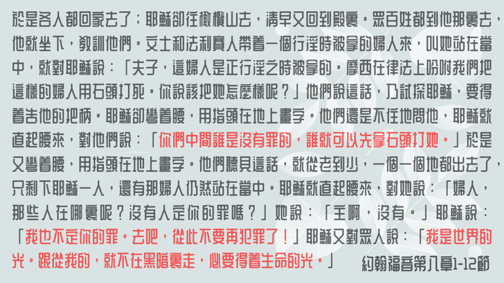 Translator Translator 1 於是各人都回家去了;耶穌卻往橄欖山去, 2 清早又回到殿裏。眾百姓都到他那裏去,他就坐下,教訓他們。 3 文士和法利...