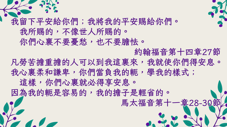 我留下平安給你們;我將我的平安賜給你們。我所賜的,不像世人所賜的。你們心裏不要憂愁,也不要膽怯。 約翰福音 14:27 CUNP-上帝 https://bible.com/bibl...