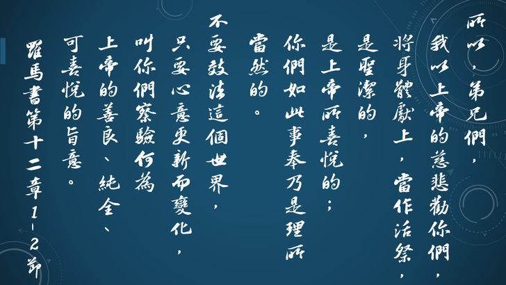 Translator Translator 1 所以,弟兄們,我以上帝的慈悲勸你們,將身體獻上,當作活祭,是聖潔的,是上帝所喜悅的;你們如此事奉乃是理所當然的。 ...