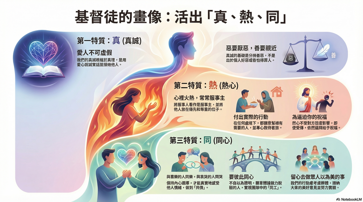 Translator 以上圖片由NotebookLM的「資訊圖表」功能所產出 9 愛人不可虛假。惡,要厭惡;善,要親近。 10 愛弟兄,要彼此親熱;恭敬人,要彼此推讓。 11 殷勤...