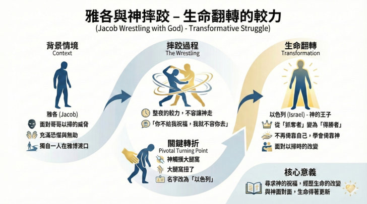 Translator           22 他夜間起來,帶着兩個妻子,兩個使女,並十一個兒子,都過了雅博渡口,  23 先打發他們過河,又打發所有的都過去, 24 只剩下雅各一人。有一個人來和他摔...