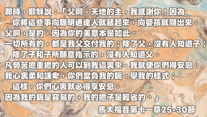 Translator 25 那時,耶穌說:「父啊,天地的主,我感謝你!因為你將這些事向聰明通達人就藏起來,向嬰孩就顯出來。 26 父啊,是的,因為你的美意本是如此。 27 一切所有...