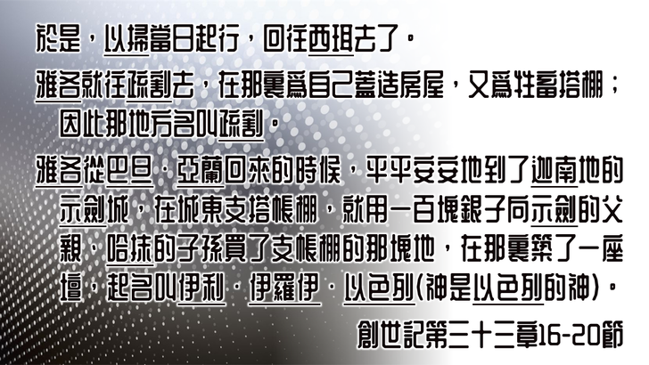 Translator 創32:1 雅各仍舊行路,神的使者遇見他。 創32:2 雅各看見他們就說:「這是神的軍兵」,於是給那地方起名叫瑪哈念。 創32:3 雅各打發人先往西珥地去,就...
