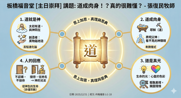 Translator 以上圖片由Google Gemini工具-建立圖像(Nano Banana)依據youtube下載的主日講道MP3與趙強的聽講紀錄綜合後繪製 1 太初有道,道...