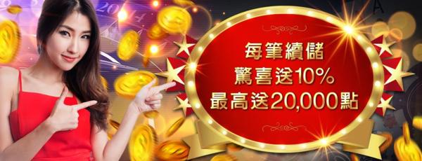 活動標題: 每筆續儲 驚喜送10% 最高送20,000 凡是第二次以上儲值享有驚喜送10% 單筆儲值10,000點以上即可享有此活動 單筆儲值20,000點以上還可與抽獎活動一併申請 申請方式: 私訊...