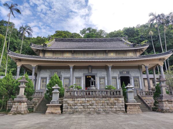 越過廣場,便是樸拙雅淨的正殿,散發著莊嚴宏壯的氛圍。裡頭可見釋迦牟尼佛、文殊菩薩、菩賢菩薩三尊佛像盤坐其中,神情怡然;殿內梁柱、天竺式天花、神龕及窗楣之細部裝飾,甚具特色,將台灣、日本及西方建築風格融為一體,極為罕見。除建築本體外,山壁上還有彌勒佛雕刻及「佛」字石刻,造型、刻工皆展現出獨特匠藝。