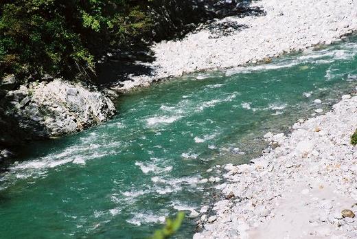 跨越溪水的大橋下附近,有處涼亭,涼亭下面有很多塊防波塊,防波塊附近有一處像半個小學游泳池那麼大的水塘,正是河面最寬廣,也最深的一處,水色清澈,藍得像面用水藍色水彩勻拓而成的明鏡。