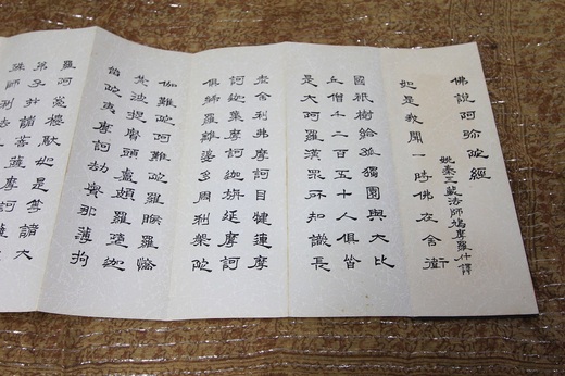 清晨醒來,梳洗、禮佛後。燃一段韾香安放在臥香爐內,安坐在小桌前,開始研墨,準備抄經。每天要抄的篇幅並不多,僅只二張,每張不到 200 字,整個書寫準備到完成約 40 分鐘。研磨的同時,將要抄寫的經文一字一句細細的研讀數次,待墨研磨好了,才開始提起毛筆寫,不徐不緩,一個字一個字寫,不求寫得華麗,沒有刻意的書體,只用一般的楷書體慢慢的寫,寫罷,就收拾好出門,開始一天忙碌的行程。