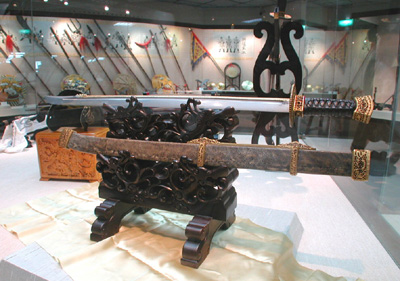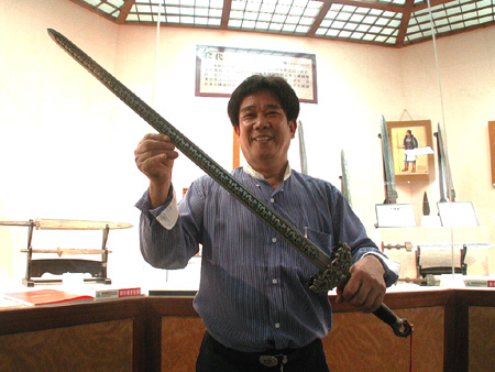 郭常喜重製的古兵器更多,包括干將、莫邪、魚腸、青龍偃月刀、砍頭刀、貝勒刀、宋江陣兵器、十八般兵器,以及,最近受電視台委託製作了電視劇「風雲」的劍都有。