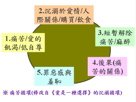 但是有不少的人因未能正視自己的傷痛,而陷入所謂的「痛苦循環」(見圖)。在《愛是一種選擇》的書中,作者漢菲特(Robert Hemfelt)博士、米勒(Frank Minirth)醫師、米爾(Paul Meier)醫師則稱之為沉溺循環。