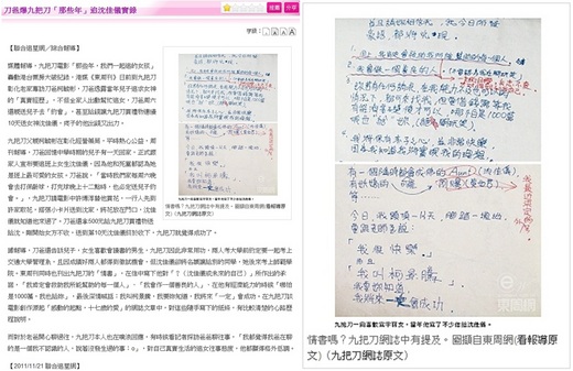 【新聞來源】由左至右分別為:100/11/21《聯合新聞網》「刀爸爆九把刀 『那些年』追沈佳宜實錄」、100/11/21《聯合新聞網》「九把刀追沈佳宜情書」