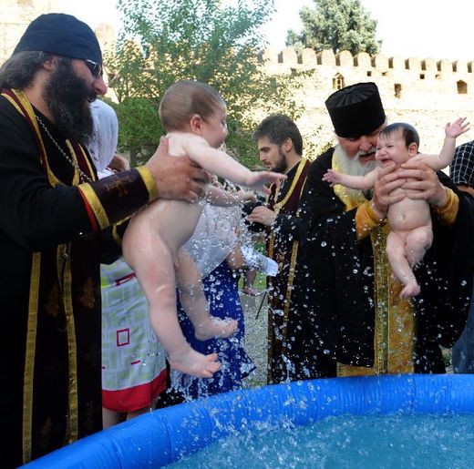 喬治亞東正教舉辦大規模的洗禮,400名嬰兒同時受洗。東正教信徒受洗都要浸到水中。(法新社)