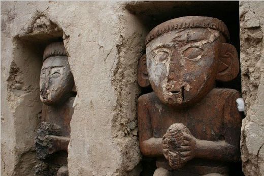 在秘魯北部的「陳陳古跡」,考古學家發現12個木雕人像,約有500年歷史。「陳陳」最輝煌時期在600年前,是當時美洲大陸最大的城市,也是奇穆文明的首都。奇穆文明大約始於西元850年,消亡於1470年。陳陳古跡已被列為世界10大瀕危古跡。(歐新社)