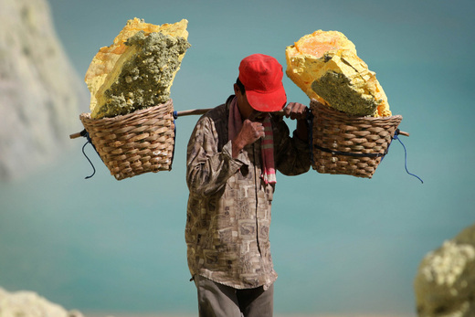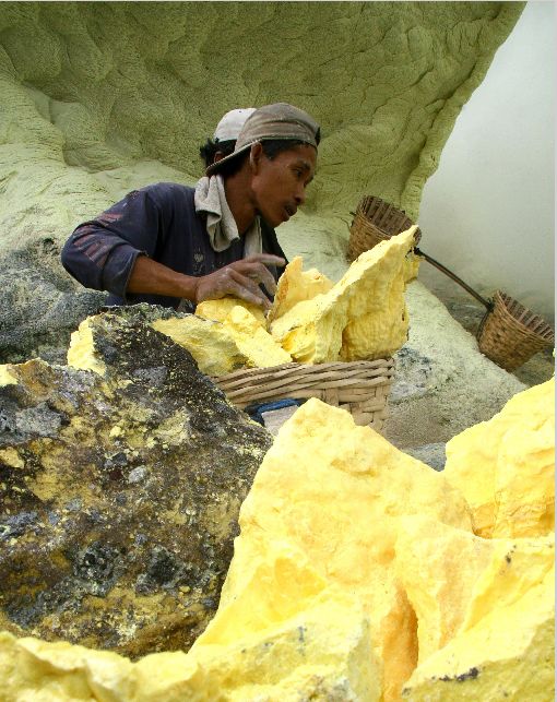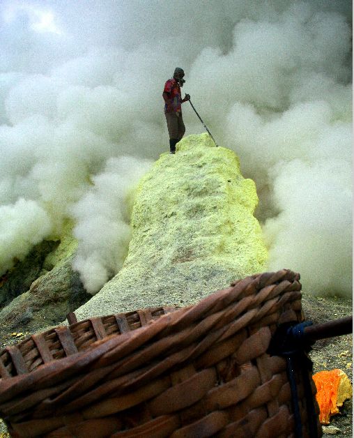 在東爪哇2300公尺高的夷真火山,一名印尼礦工正在火山口挖掘硫磺,放在竹筐裡,挑下山。夷真是有名的硫磺火山,火山口深達175公尺,是世界最大的火山坑。印尼有400多座火山,其中活火山達130多座。(法新社、取自網路)