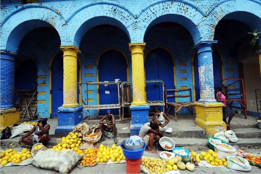海地發生規模七的地震,許多人流離失所,食物嚴重短缺。下圖一家商店前的臨時攤販。(法新社)