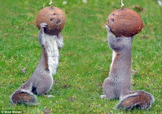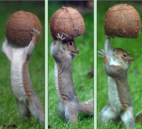 2008年,英國普茲茅斯的攝影師沃克在自家花園拍到一隻松鼠為了吃椰肉,竟站立起來,將椰子殼高舉過頭,甚至扣在腦袋上,非常逗趣。
