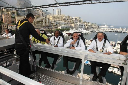 高空用餐概念的創始者是比利時商人David Ghysels,至今已辦了500多場空中宴會。上週在摩納哥舉辦的空中晚餐,一頓一千歐元,其實不算很貴;價錢取決於到多遙遠的國家,或者多奇特、困難的場地,以及聘請的是多有名的米其林星級廚師。
