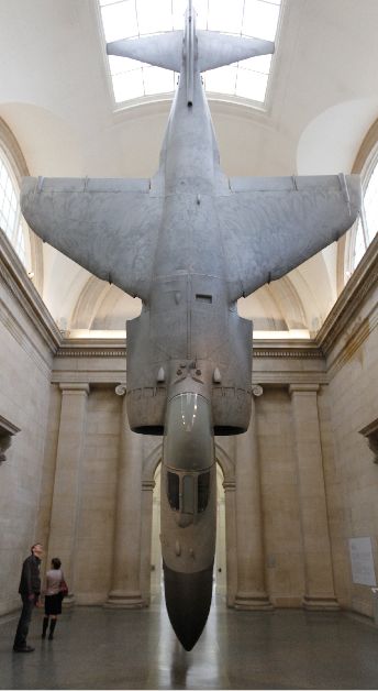 鷂式戰鬥機模倣同名鳥類設計,被倒掛在美術館天花板上。美洲虎戰鬥機則翻倒在地板,機體打磨得十分光滑,成為一面映照周圍環境和遊客反應的鏡子。