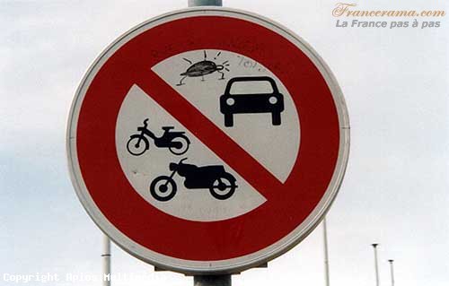 上圖:阿瑞斯小鎮的一個交通告示牌,畫了禁止通行的圖樣,除了禁行汽機車,還禁止飛碟…。