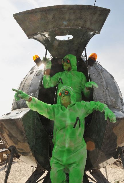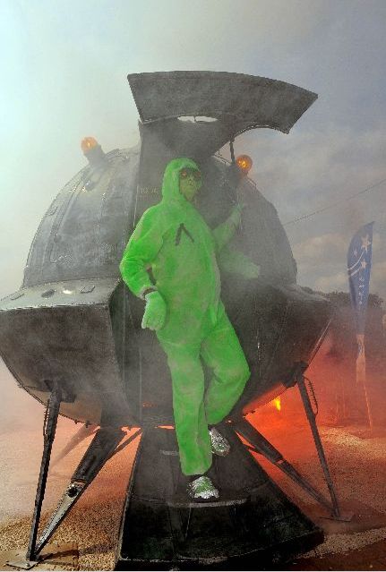 下圖:法國西阿瑞斯鎮,兩個打扮成外星人的鎮民,逃出一艘冒煙假飛碟。