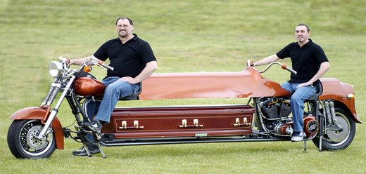 紐西蘭奧克蘭市的汽車工程師麥克,用哈雷機車改造成全球第一輛摩托車「靈車」。哈雷機車切成兩截,中間裝上支架,
